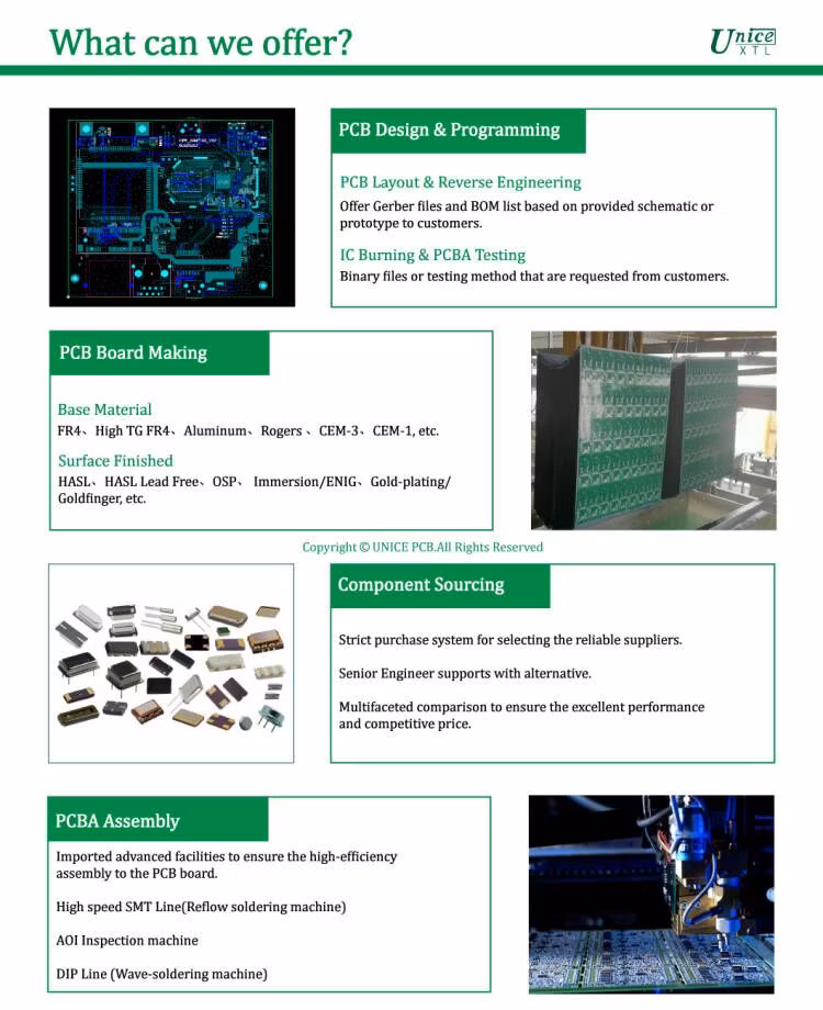 Nos especializamos en la producción de placas de circuitos PCB a granel (una cara, doble cara, multicapa de 4 a 20 capas), placas de circuitos LED de aluminio, y PCBA , que incluye todo tipo de industrias+PCB+SMT+DIP+adquisición de BOM (un servicio de paquete).